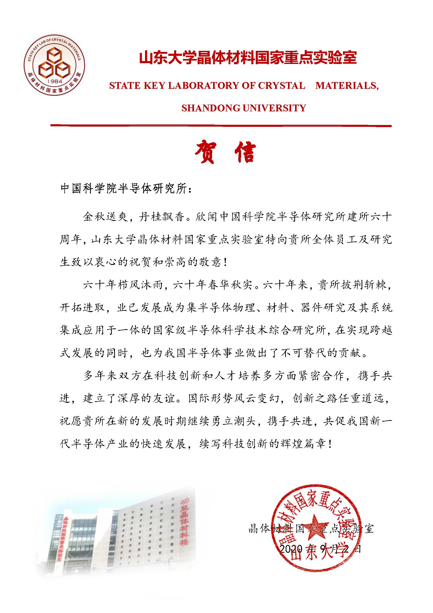 山东大学晶体材料国家重点实验室贺信