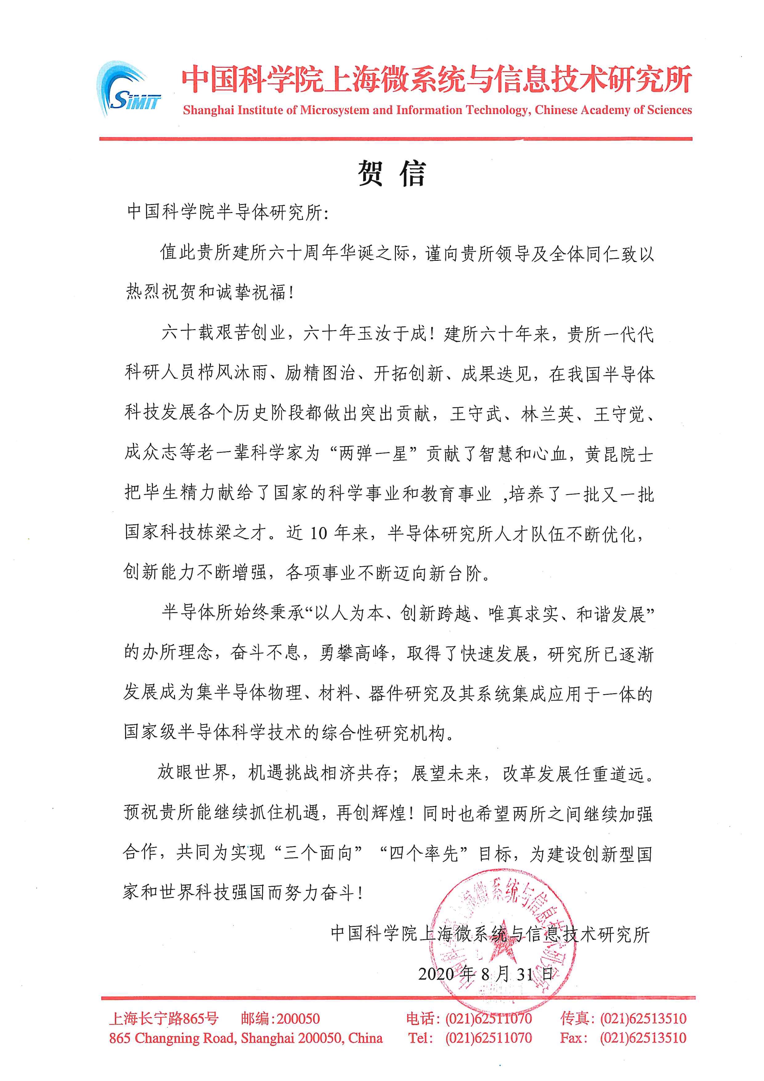 中国科学院上海微系统与信息技术研究所贺信