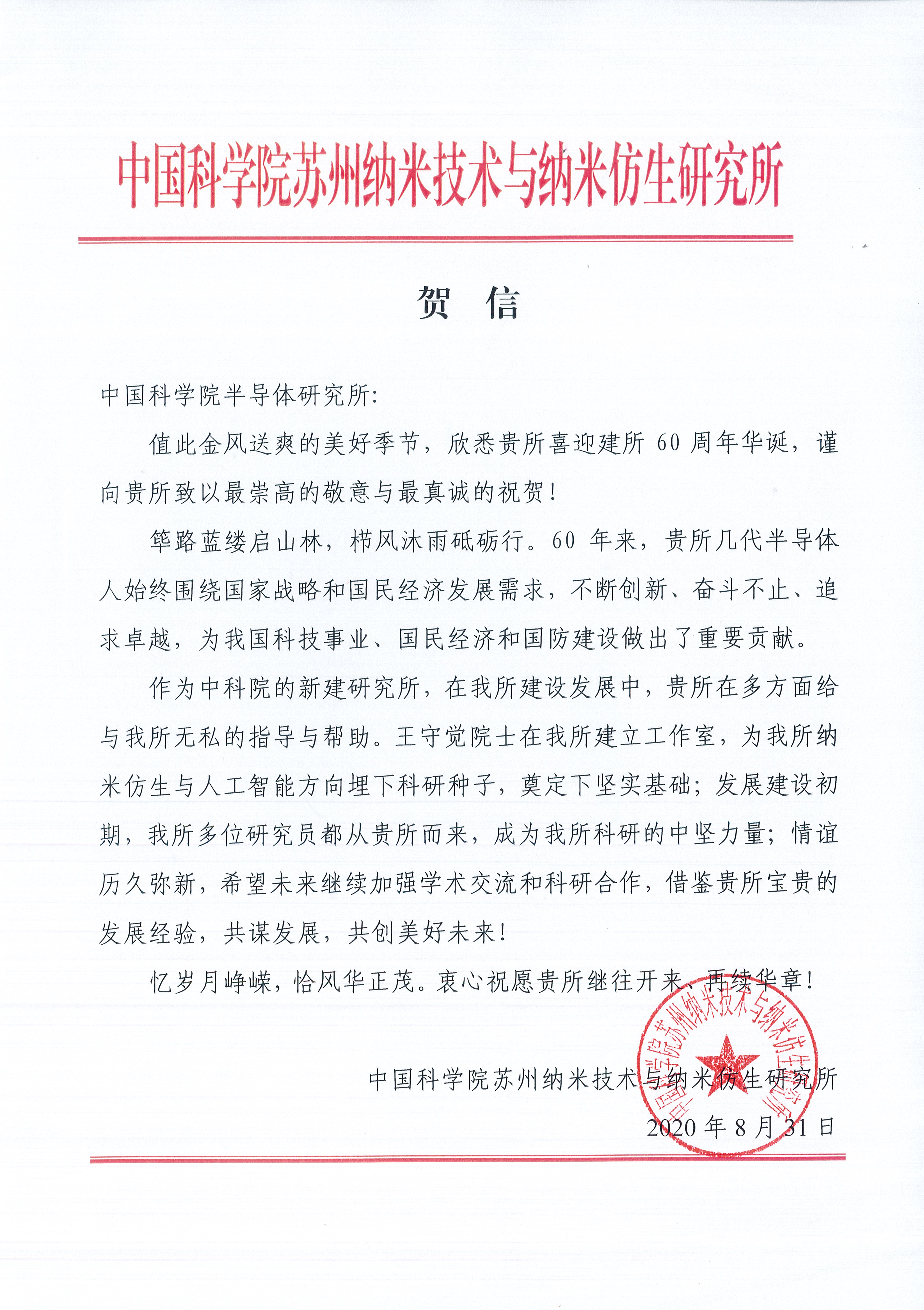 中国科学院苏州纳米技术与纳米仿生研究所贺信