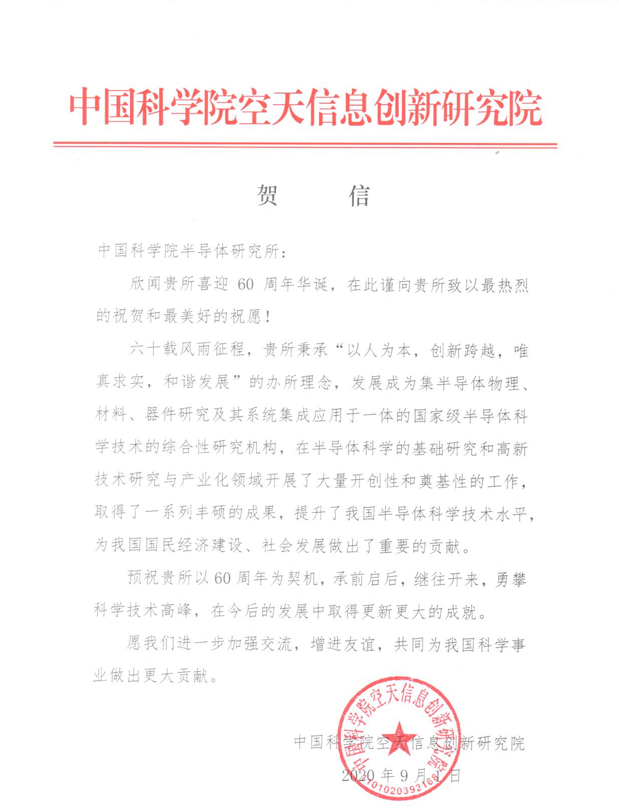 中国科学院空天信息创新研究院贺信