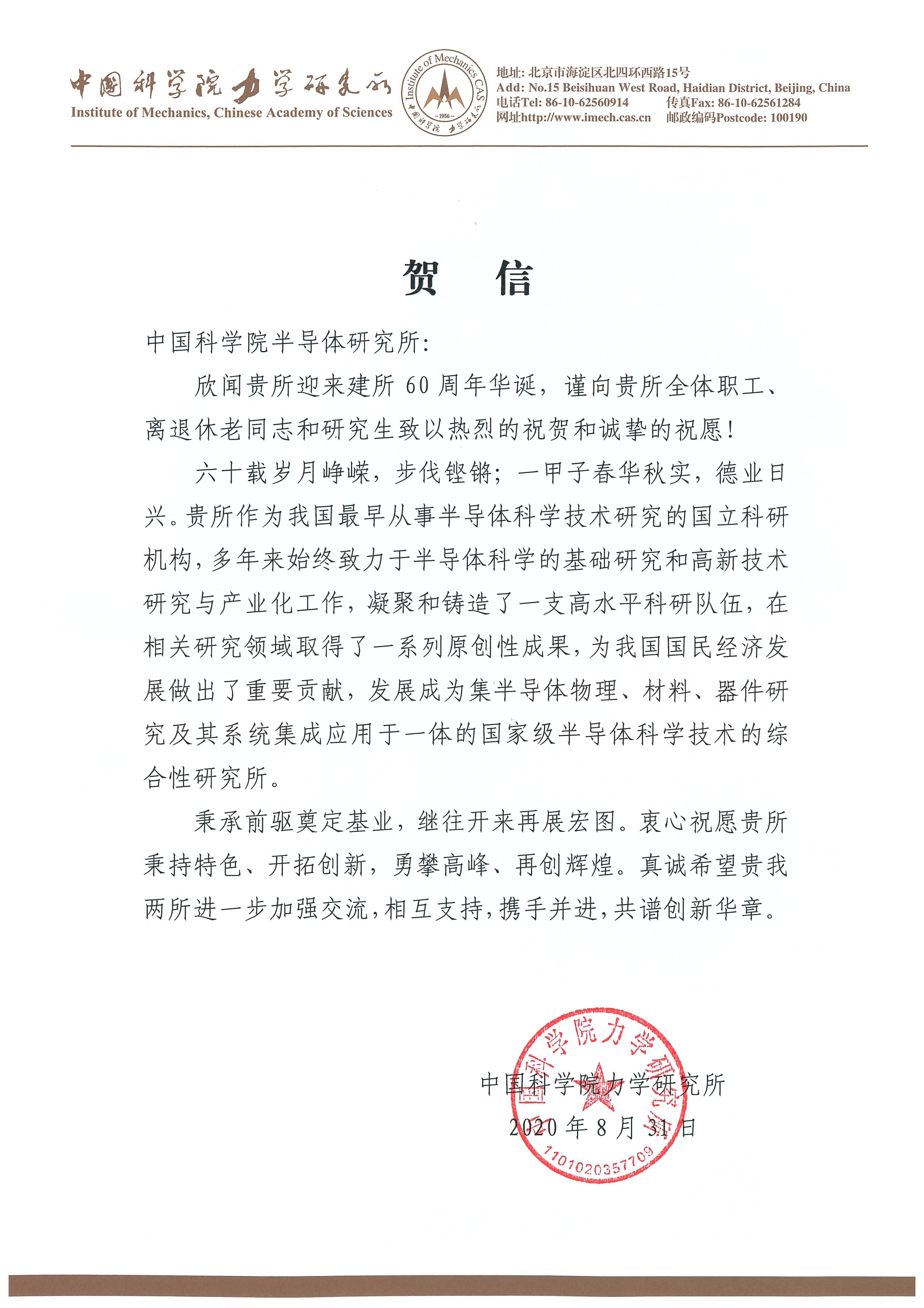 中国科学院力学研究所贺信