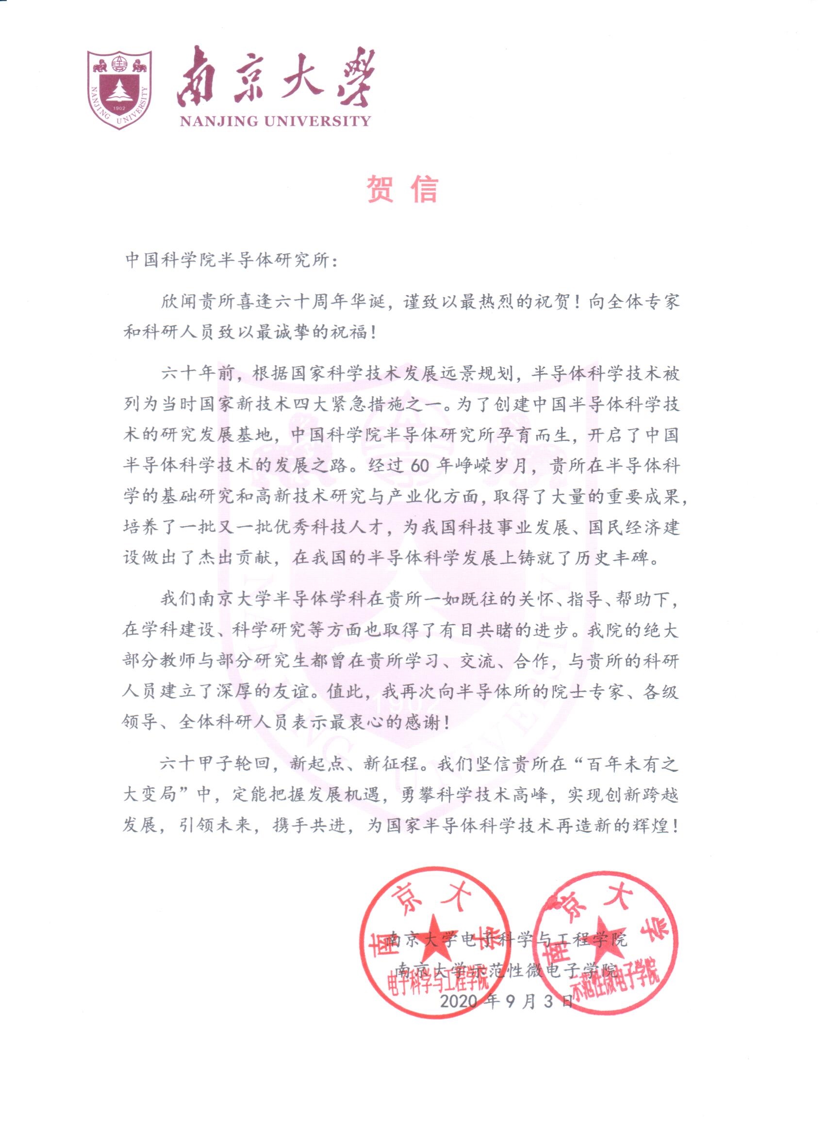 南京大学电子科学与工程学院、示范性微电子学院贺信