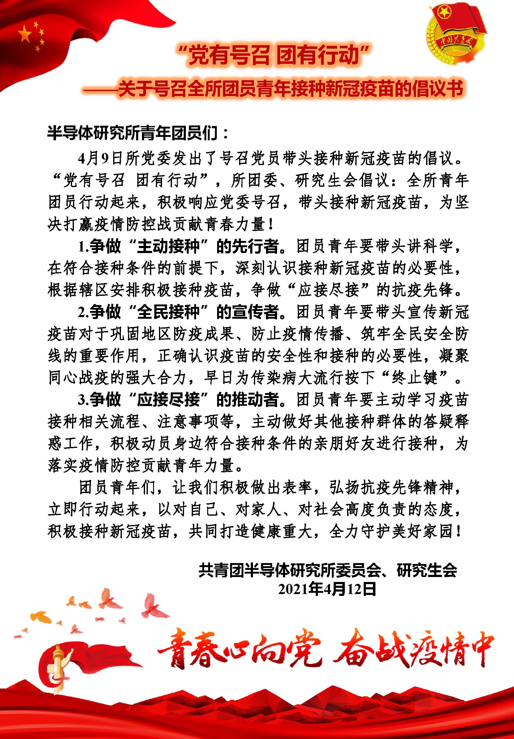 - “党有号召 团有行动”——关于号召全所团员青年接种新冠疫苗的倡议书2021-04-12