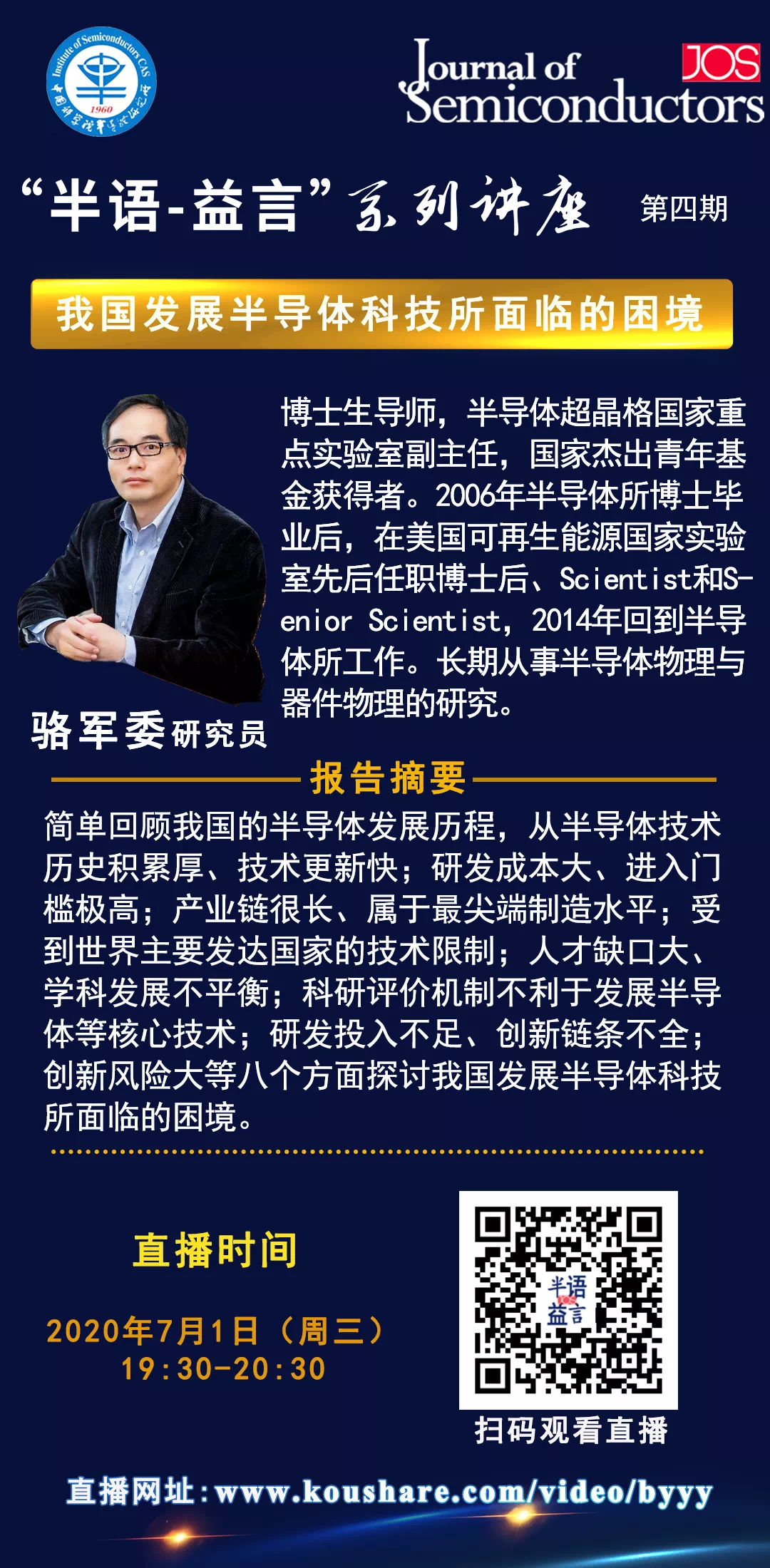 - 【直播预告】“半语-益言”第四期 | 骆军委研究员:我国发展半导体科技所面临的困境2020-06-29
