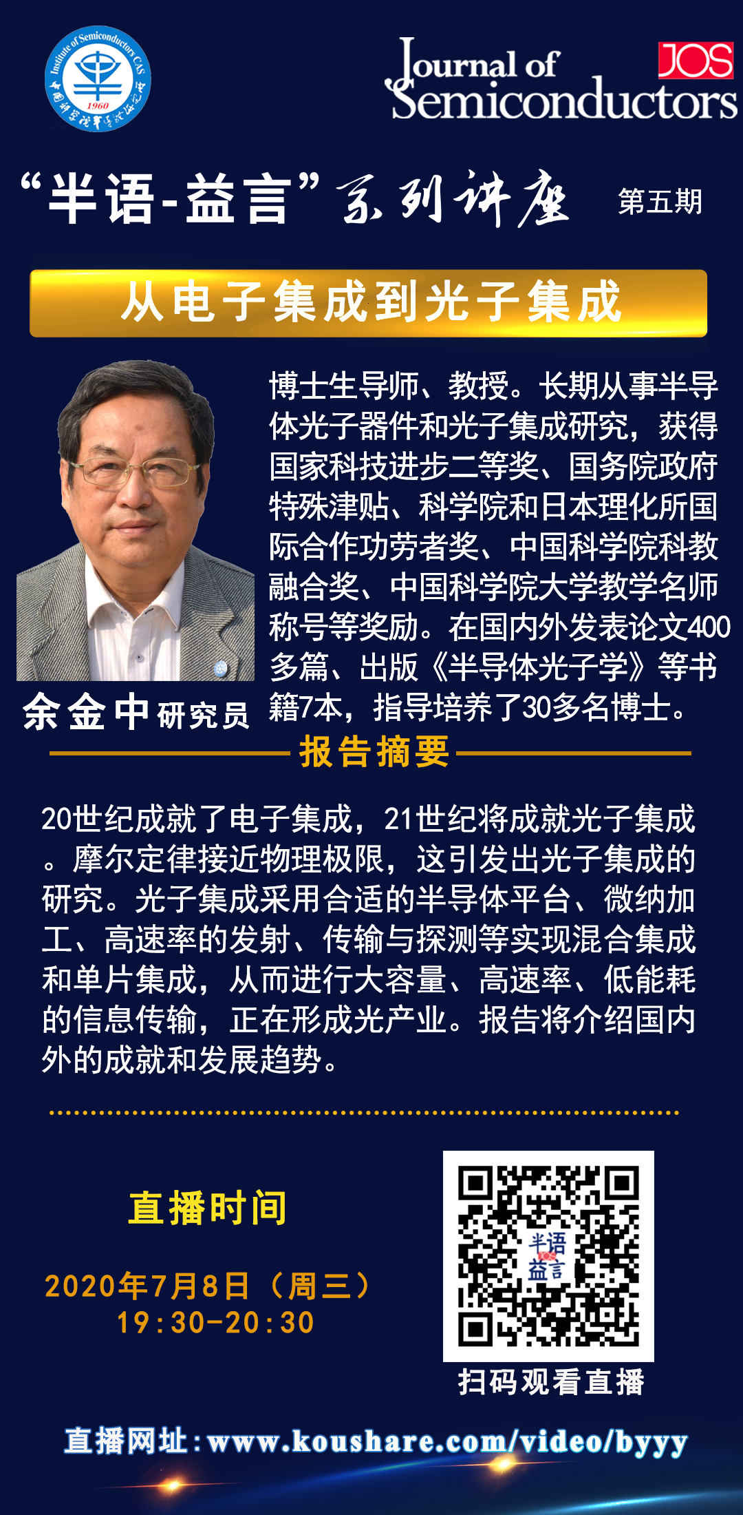 - 【今晚直播】“半语-益言”第五期 | 余金中研究员:从电子集成到光子集成2020-07-08