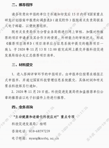 附件是院关于组织推荐国家重点研发计划“主动健康和老龄化科技应对”重点专项2020年度项目的通知,请各有意向申报的人员在10月16日之前填报附件申报意向调查表,以便统筹组织,过时不候。