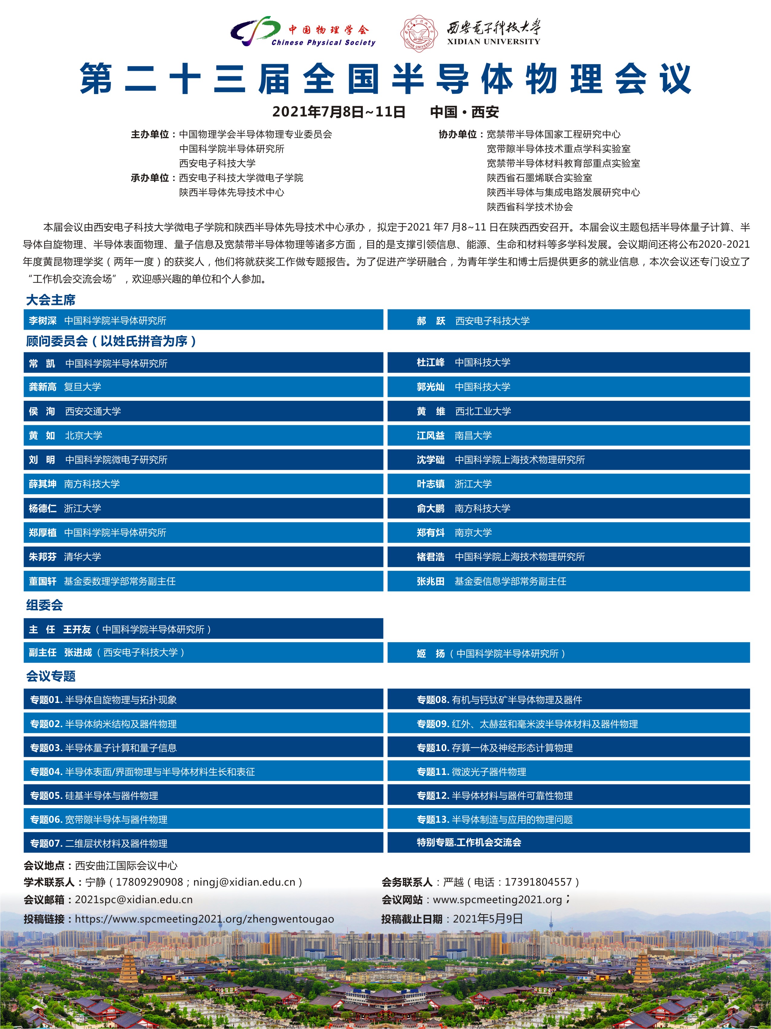 第23届全国半导体物理学术会议将于2021年7月8-11日在陕西西安召开。会议主题包括半导体量子计算、半导体自旋物理、半导体表面物理、量子信息及宽禁带半导体物理等诸多方面,目的是支撑引领信息、能源、生命和材料等多学科发展。参会人员包括政府领导、科研单位、高校知名专家学者及青年学生等,会议预计规模超2000人, 欢迎各位老师和同学踊跃参加。为了促进产学研融合,本次会议还专门为青年学生和博士后设立了“工作机会交流专场”。