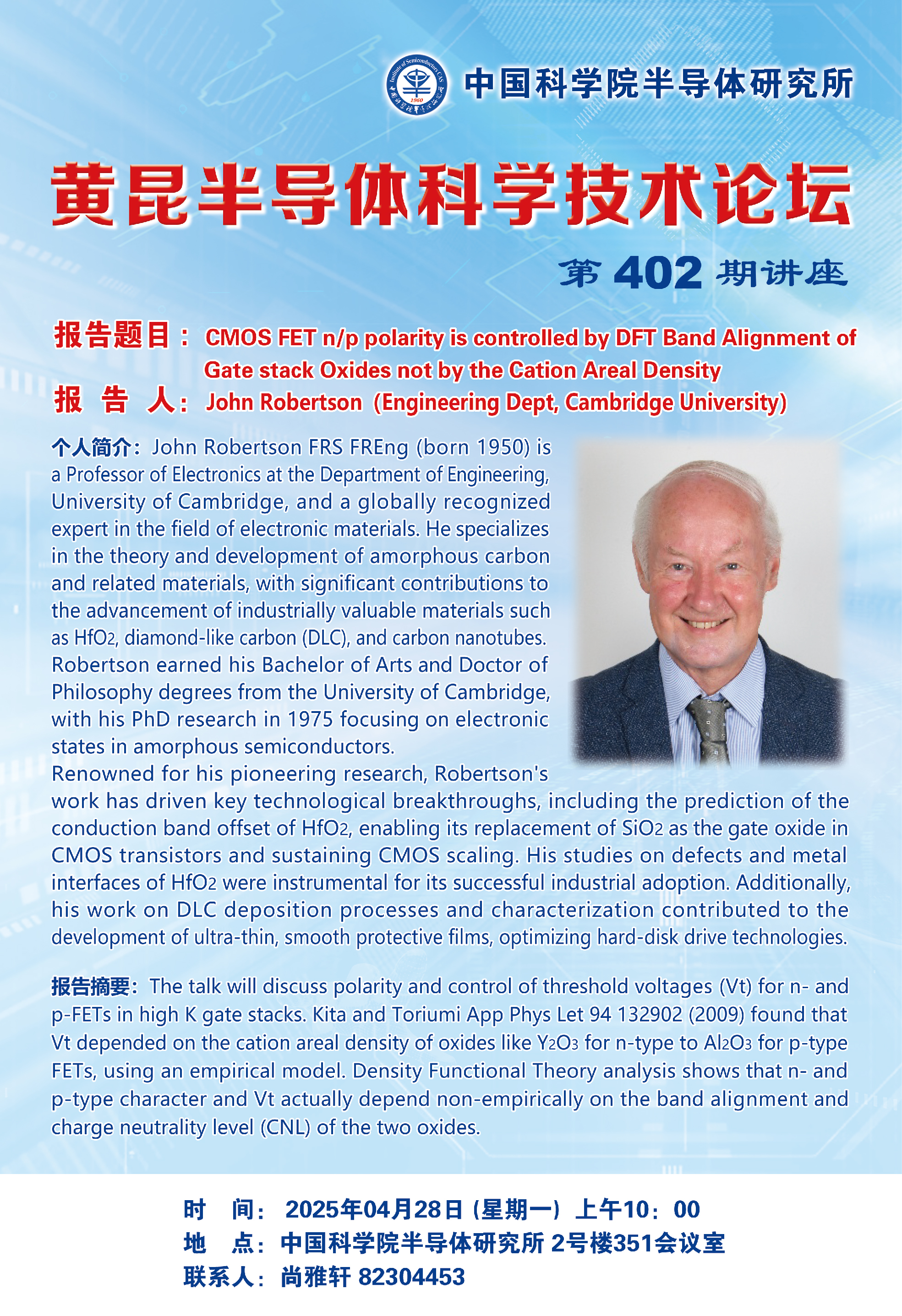应骆军委研究员的邀请,John Robertson教授将于2025年4月28日来所交流并在黄昆半导体科学技术论坛上作第402期报告。请感兴趣的老师同学积极参加。