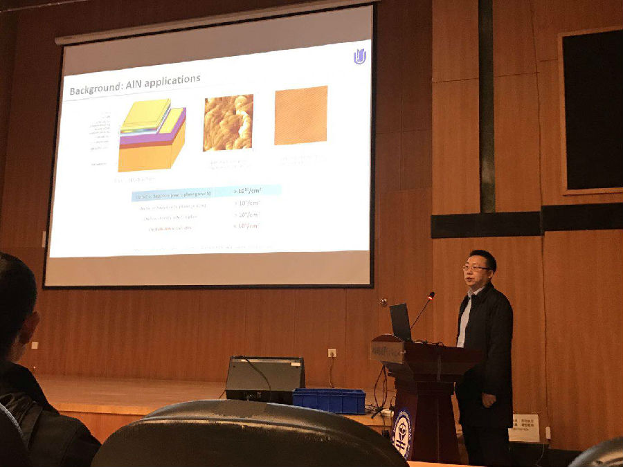 交流会上,吴亮教授作了题为Novel Approach to Grow High-Quality and Large-sizeFreestanding AlN Single Crystals by PVT Method的学术报告,系统地介绍了采用PVT生长AlN单晶的方法,对AlN单晶材料的研究背景、意义、前景及方法进行了精辟的阐述,发表了自己独到的见解,并与在座的30余名博士和硕士研究生进行了热烈的讨论和交流,使大家受益匪浅。