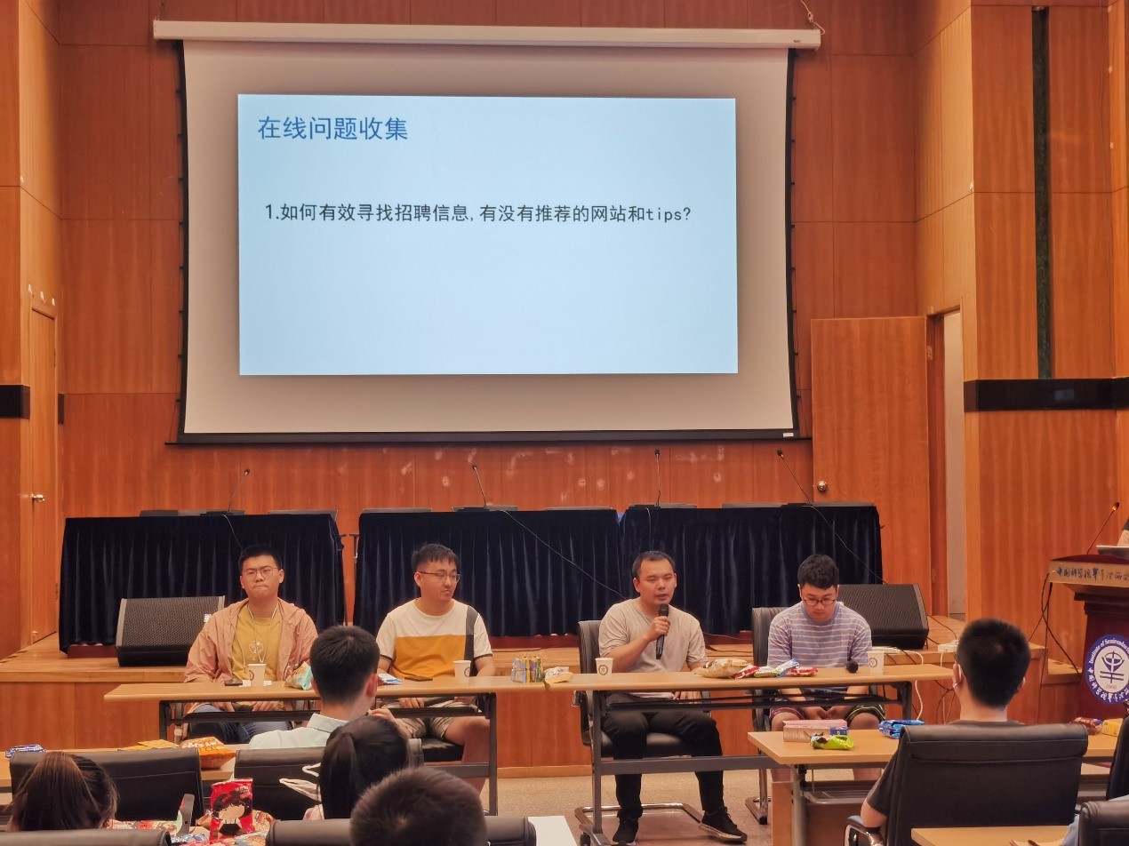 活动伊始,四位毕业生嘉宾分别对自己毕业与求职的经历进行了介绍。为了更好地了解同学们的疑惑,研究生会在活动前期在线收集了一系列问题,四位师兄以及现场同学饶有兴致地对这些问题讨论开来。一位同学的线上问题中问道个人简历如何突出重点,胡皓月师兄现身分享自己跨专业求职的经历,对于如何在简历中突出自己能力特点、以及平衡入职职位需求提出了自己的建议。而另一个线上问题则提到了高校科研岗位的求职问题,储泽马师兄也结合自己申请过程中了解的一些经历给出了详细的说明。