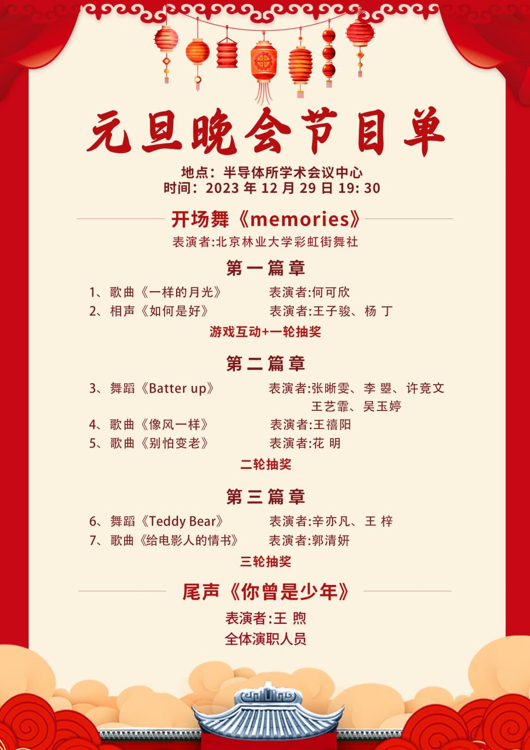 一元复苏,万象更新。为辞旧迎新,共建我所和睦气氛,促进师生交流,展示我所师生风采,系元旦降临之际,经过紧张有序的地准备,半导体所2024年“逐梦青春”元旦晚会将于2023年12月29日晚19:30于半导体所学术会议中心举行即将与您见面。
