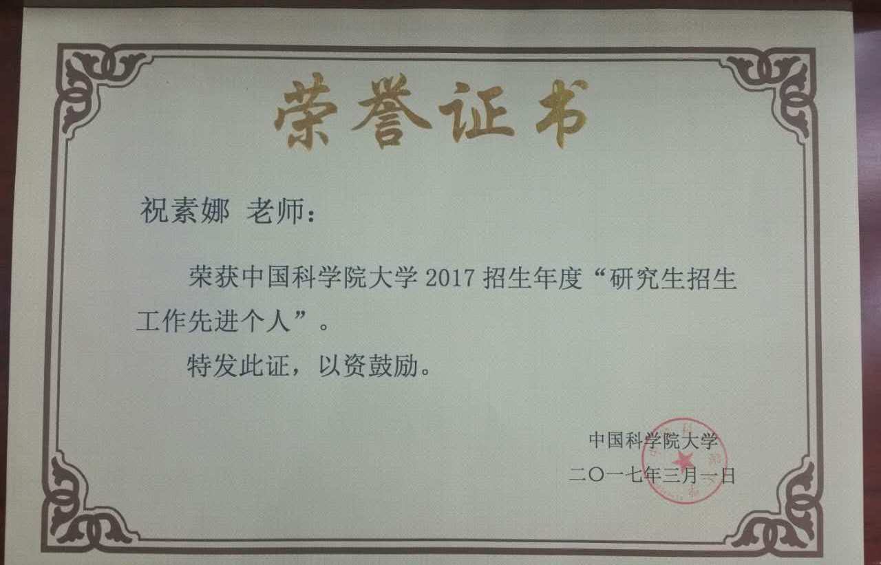 会议隆重表彰了2017招生年度研究生招生工作中表现出色的单位和个人,我所研究生部主任祝素娜荣获“研究生招生工作先进个人”荣誉称号。