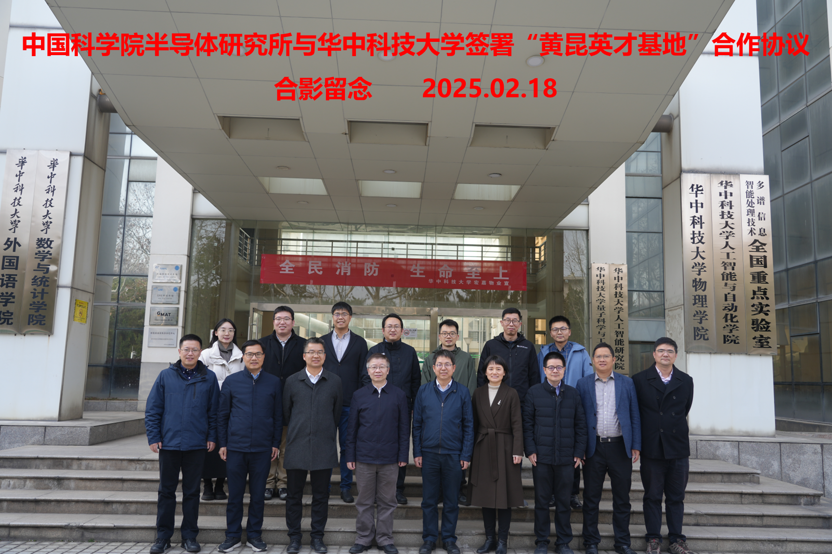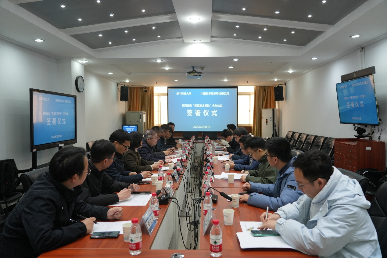 为深入贯彻习近平总书记关于加强基础学科人才培养的重要讲话精神,进一步落实中国科学院关于推进科教融合的战略部署,2025年2月18日,中国科学院半导体研究所与华中科技大学在华中科技大学逸夫科技楼举行了“黄昆英才基地”合作协议签署仪式。本次合作旨在通过整合双方的优势资源,共同推动半导体学科领域的创新青年人才培养。出席本次签约仪式的有半导体所所长谭平恒,华中科技大学校长助理、本科生院院长文劲宇,华中科技大学物理学院党委书记刘会平、院长蔡建明、副院长吕京涛、副院长王顺、党委副书记姜宗显,华中科技大学光学与电子信息学院院长唐江,党委副书记、副院长张敏明,党委副书记李文龙,以及相关学院的教师代表,半导体所魏钟鸣、邓惠雄、魏大海、吴江滨等教师代表参加仪式。仪式由华中科技大学物理学院党委书记刘会平主持。