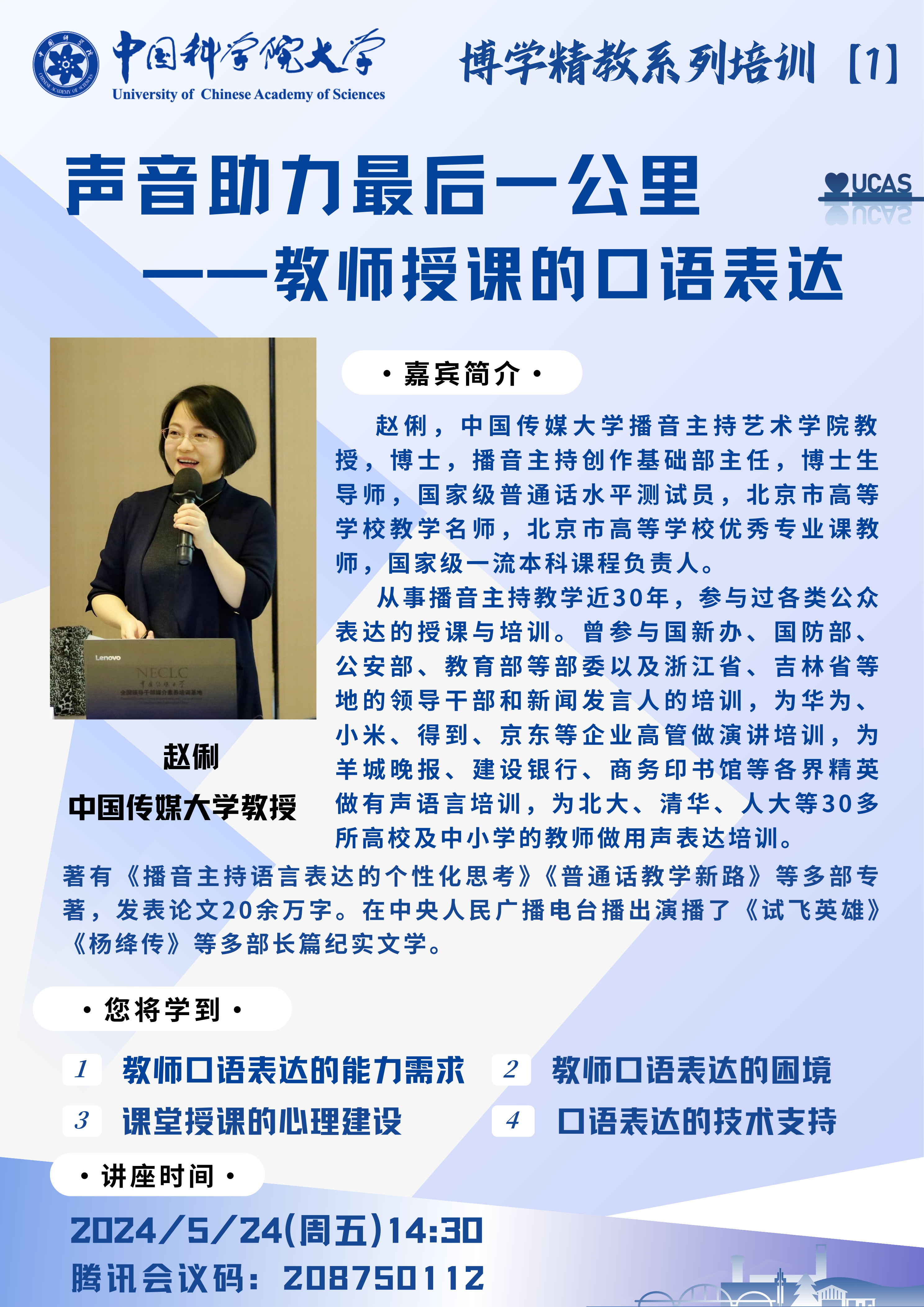 主讲内容:赵俐教授将为我们讲解教师口语表达的能力需求、教师口语表达的困境、课堂授课的心理建设、口语表达的技术支持等内容,培训中会带领大家模拟练习授课的口语表达。