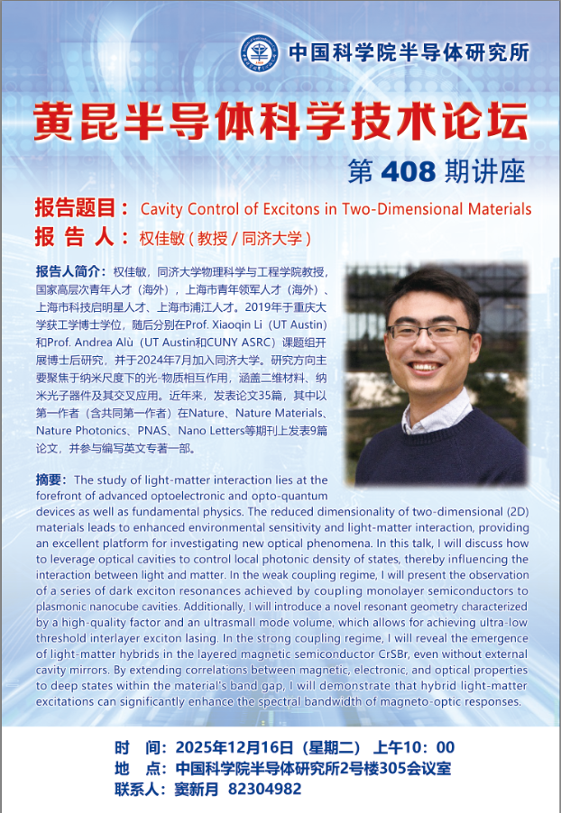 应谭平恒研究员的邀请,权佳敏教授将于20251216日来所交流并在黄昆半导体科学技术论坛上作第408期报告。请感兴趣的老师同学积极参加。