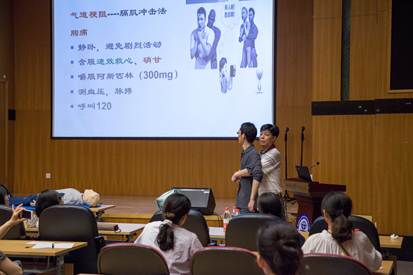 活动伊始,张江义以一个真实案例导入此次讲座主题,他表示在突发事件的第一现场,如果有人能在专业急救人士到来前对病人进行急救,就有可能挽救生命。接着张江义为大家讲解了心肺复苏的概论、目的及意义,使大家对于心肺复苏有了初步的了解。他强调时间就是生命,并指出心跳骤停后4-6分钟为最佳救治时间。此外,张江义详细地为大家讲解心肺复苏的操作步骤,分为判断、呼救、胸外按压、打开气道和人工呼吸五步,并且用模拟人边操作边讲解。他邀请大家上台进行现场操作,手把手指导现场职工、学生对伤者进行有效抢救。最后,张江义希望参加讲座人员掌握一定急救技能后,在遇到紧急情况时,能伸出双手献出爱心,带给别人生的希望。