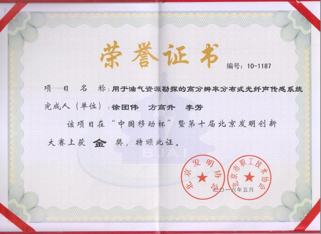 2016年5月10日下午,第十届北京市发明创新大赛颁奖典礼在国家图书馆音乐厅举行,半导体所光纤传感组徐团伟、方高升、李芳三位同志的项目“用于油气资源勘测的高分辨率分布式光纤声传感系统”获得金奖。