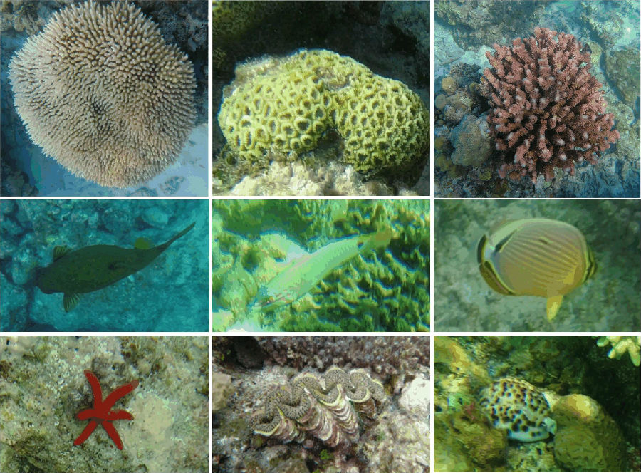 图3 海域美丽的珊瑚、鱼类、海星、砗磲等