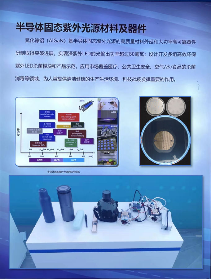 基于第三代半导体材料的紫外光源具有低功耗、无汞、轻便灵活等优点,在生命健康、农作物生长、印刷固化等领域有重要应用。半导体所在2003年起布局深紫外固态光源研发,研制出国内首支深紫外LED器件。“十三五”期间,半导体所牵头承担了科技部重点研发计划战略性先进电子材料专项“第三代半导体固态紫外光源材料及器件关键技术”,集中了16家产学研优势单位对AlGaN基第三代紫外固态光源开展联合攻关。通过技术优化,深紫外LED在350 mA注入电流下的光输出功率超过110 mW;深紫外LED模组光功率密度达到1.52 W/cm²。通过成果转移和产业化,目前已经建成了国内规模最大的深紫外LED外延芯片生产线。