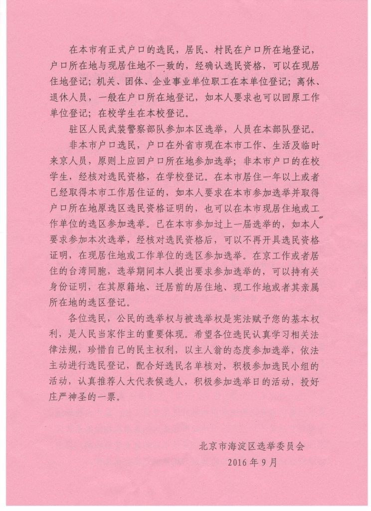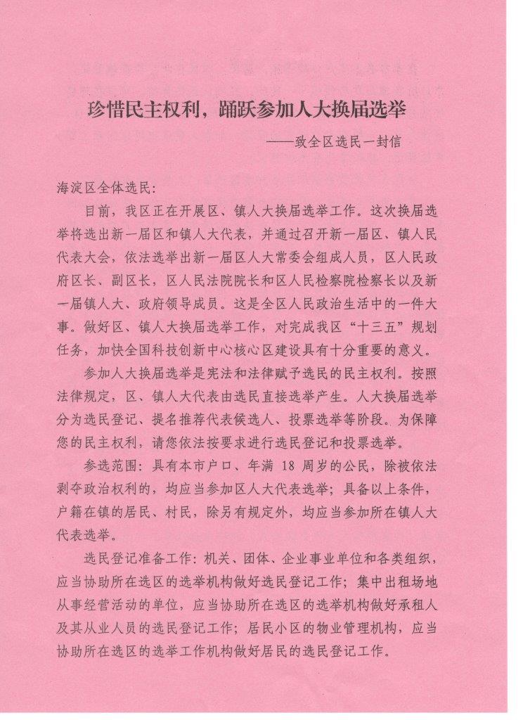 珍惜民主权利,踊跃参加人大换届选举——致全区选民一封信