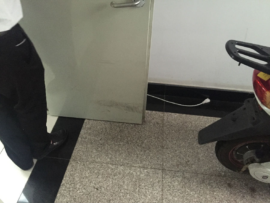 二、有人将电动自行车放到步行梯口充电,并违规在楼道内连接电源线;