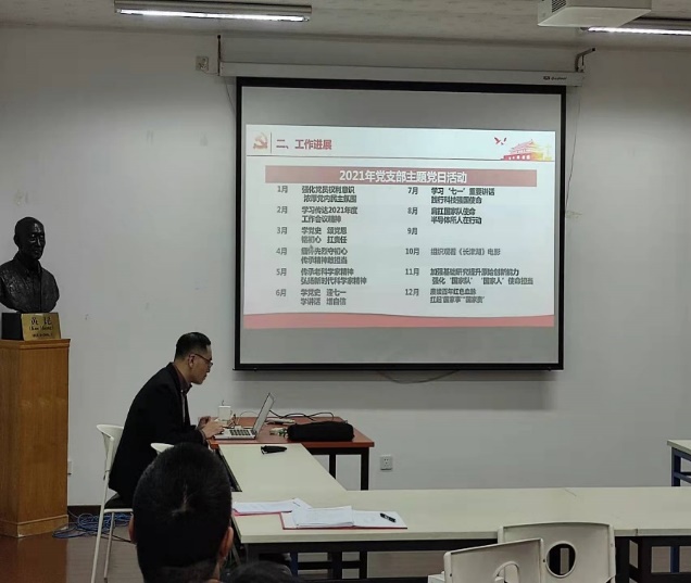 会议第二项议程是对支部2021年工作进行了回顾与总结。主要从思想政治工作、组织生活工作、发展党员工作、不足之处及下一步工作计划等方面展开。