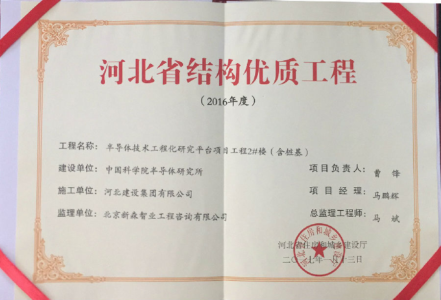 我所廊坊园区在建十二五项目“半导体技术工程化研究平台项目”在建设初期即申报了“河北省结构优质工程”奖的申报,并在建设管理过程中强化管理,依次通过了专家组的例行检查、随机抽查、资料评审等环节,2016年11月份通过了河北省建设厅组织的专家组验收,获得了“河北省结构优质工程”奖。目前工程正进行公共区域装修、机电设备安装及外管线施工阶段,预计8月份可达到竣工验收条件。