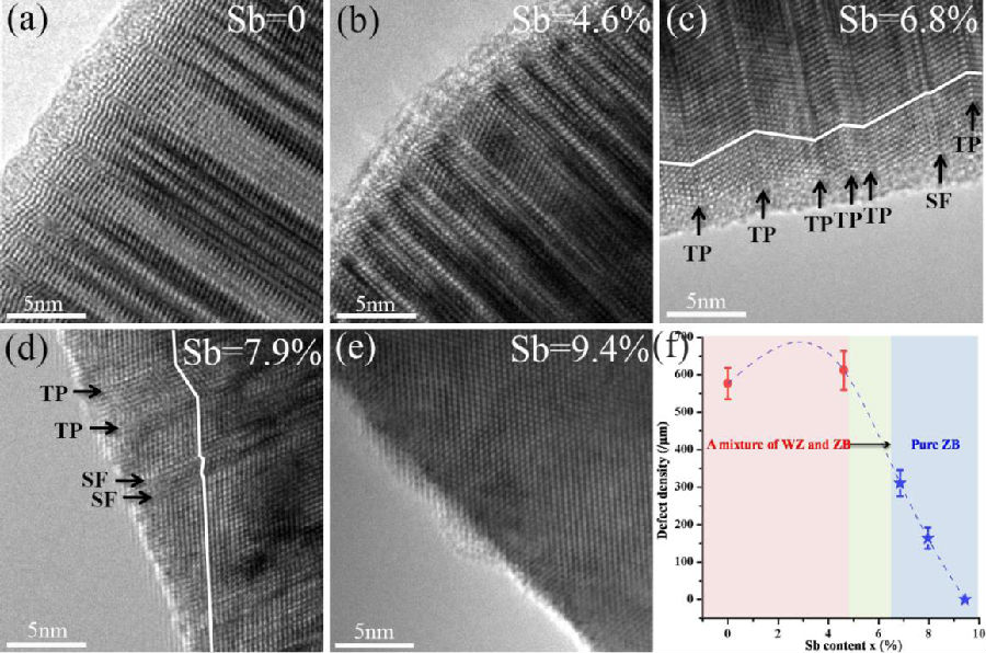 图2. 不同Sb组分对InAs(Sb)纳米线晶格质量的影响。