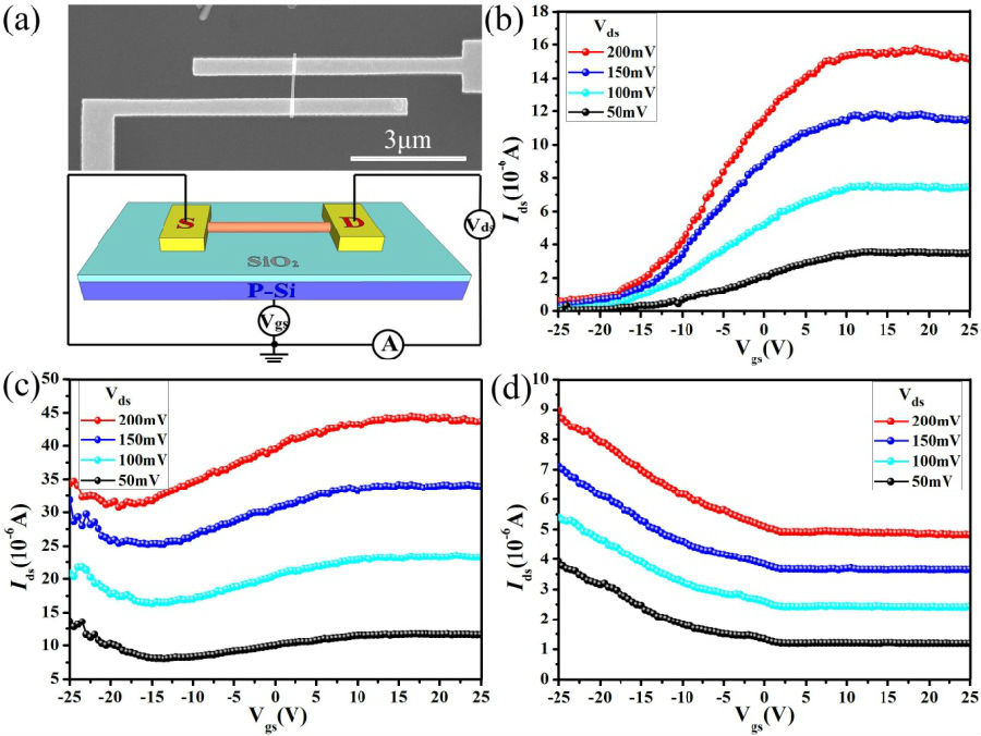图3. (a)单根纳米线背栅场效应晶体管示意图;(b-d) InAsSb核和GaSb壳厚分别为~6nm和~13nm的核壳异质结纳米线FET的转移特性曲线。