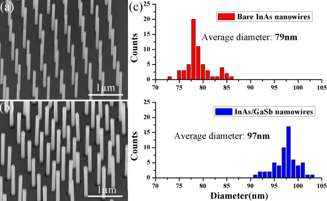 图1. (a) InAs、(b) InAs/GaSb核壳异质结纳米线阵列SEM形貌图和(c)直径统计。