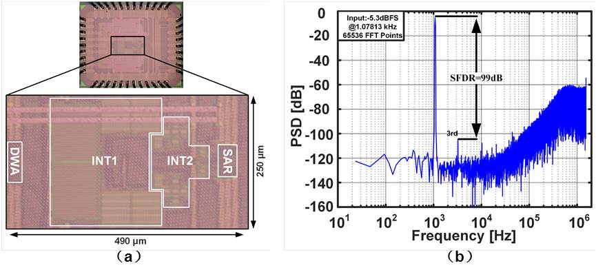 调制器采用运用四位逐次逼近量化器的两阶前馈架构,包括两个基于新型动态放大器的开关电容积分器和一个四比特逐次逼近量化器。积分器采用新型时序控制电路解决了电压跌落问题;采用加速支路在有效的共模电压范围内提高了积分器的差模特性;采用两种闪烁噪声抑制技术,改善了信噪比(SNR)。基于65nm CMOS工艺实现了调制器,测试结果表明,24kHz带宽内信号噪声失真比(SNDR)为89.6 dB,动态范围(DR)为91 dB,功耗仅为49μW @ 0.8 V电源电压。图1(a)和(b)分别为芯片照片和测量的输出信号频谱结果。论文第一作者为直博五年级学生马松。