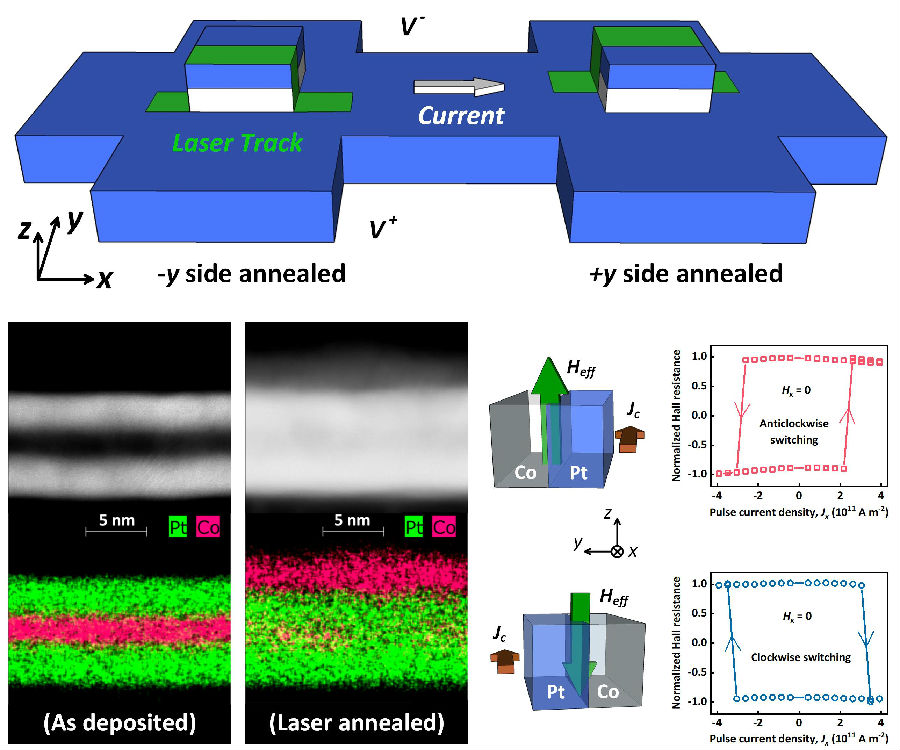 图1 局域激光退火后Pt/Co/Pt结构中由LSOT诱导的Co层磁化定向翻转。当上下Pt厚度分别为3nm和2.6nm时,来自它们的传统SOT效应几乎相互抵消,而垂直磁化的Co层依然可以在LSOT诱导下实现完全的定向翻转。