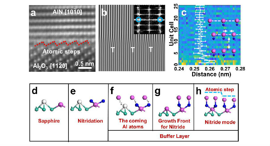 图4. AlN/蓝宝石界面原子结构。a) AlN/蓝宝石界面处的HAADF-STEM图像。界面上出现了原子步长和周期性的锯齿状结构,显示出失配位错阵列;b)AlN/蓝宝石界面IFFT图像。插图是图a)的FFT结果;c) 界面处AlN的c面晶格间距的定量测量结果,由于蓝宝石中Al原子的晶格失配和特殊的原子配位,导致第1层Al-N层原子间距最大,从而导致平面内晶格的收缩。氮化物/蓝宝石界面的原子级生长过程示意:d) 原始蓝宝石表面的原子构型,低铝位被占据;e) 氮化过程中氮原子与低位Al成键;f) 高位Al位点的占据;g) 在AlN/蓝宝石界面形成的氮化物生长前端;h) 生长逐渐演变为正常氮化物生长模式。