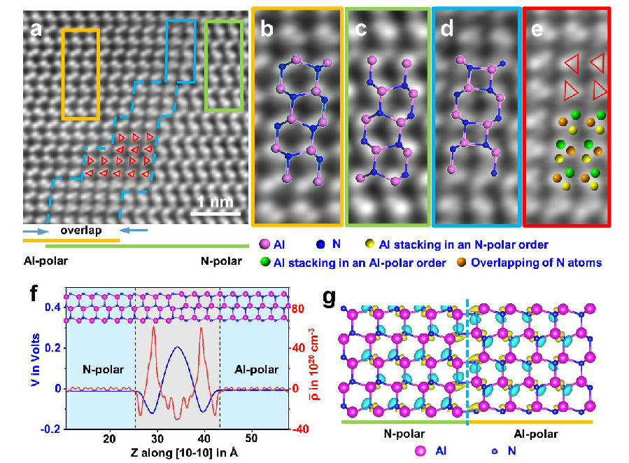 图5. IDBs原子排列的STEM截面图。a) IDB原子分辨iDPC图像,极性反转发生在(10-10)面并呈阶梯状;极性反转区域两侧b)Al-polar和c) N-polar AlN晶格iDPC图像;d) IDB区域的iDPC图像及叠加的原子模型,在边界处出现了八重键和四重键;e) IDBs区域下侧的iDPC图像,表明Al极区和N极区重叠。f) IDBs区域沿[10-10]方向的平面平均静电势(蓝色)和总电荷密度(红色)分布;g) IDBs处的电荷差分密度分布图。黄色表示电子聚集,青色表示电子耗尽,在极反转界面可以观察到一个明显的电子耗竭,因此,产生了带正电荷的二维空间区域。