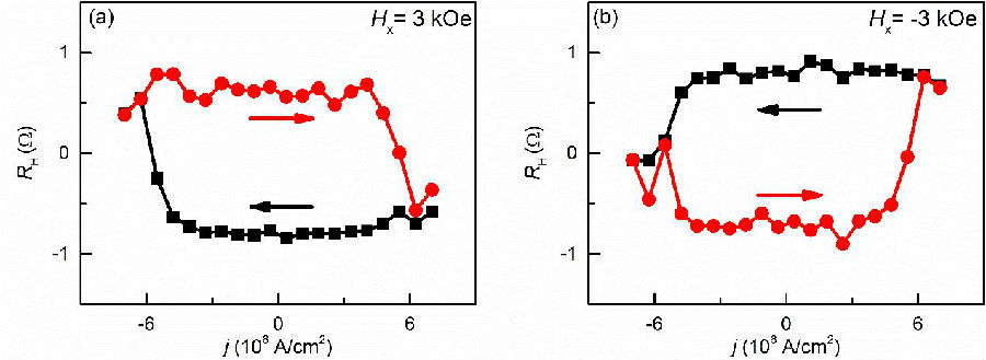 图3. 新型体自旋轨道矩驱动巨大垂直磁各向异性和高矫顽力FeTb薄膜(Hk ≈ 35 kOe, Hc = 1. 6 kOe)实现低电流密度翻转(~5MA/cm2)。