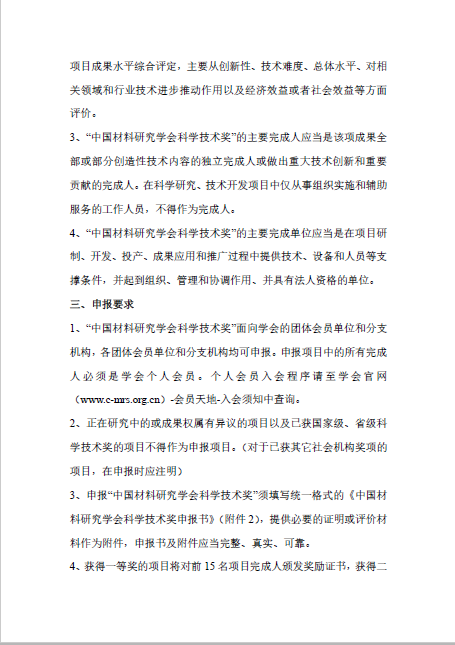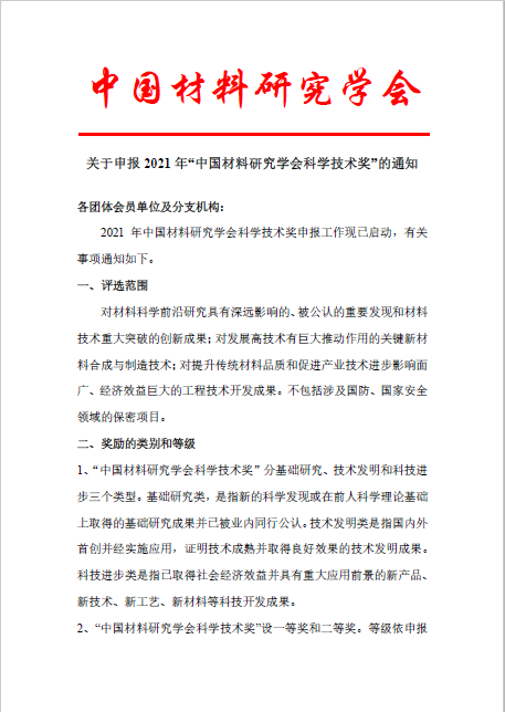 2021年度“中国材料研究学会科学技术奖”申报工作现已启动。现将提名工作有关事项通知如下: