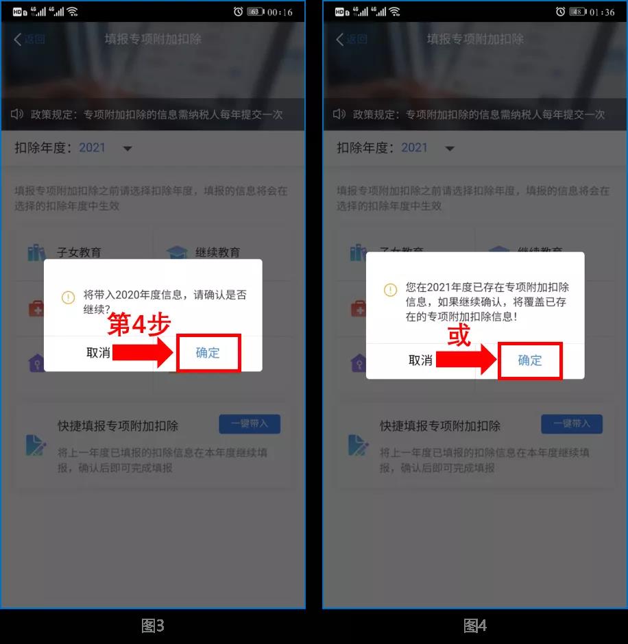 ② 依据提示“将带入2020年度信息,请确认是否继续?”或者“您在2021年度已存在专项附加扣除信息,如果继续确认,将覆盖已存在的专项附加扣除信息!”,确认后点击“确定”;如下图3、图4: