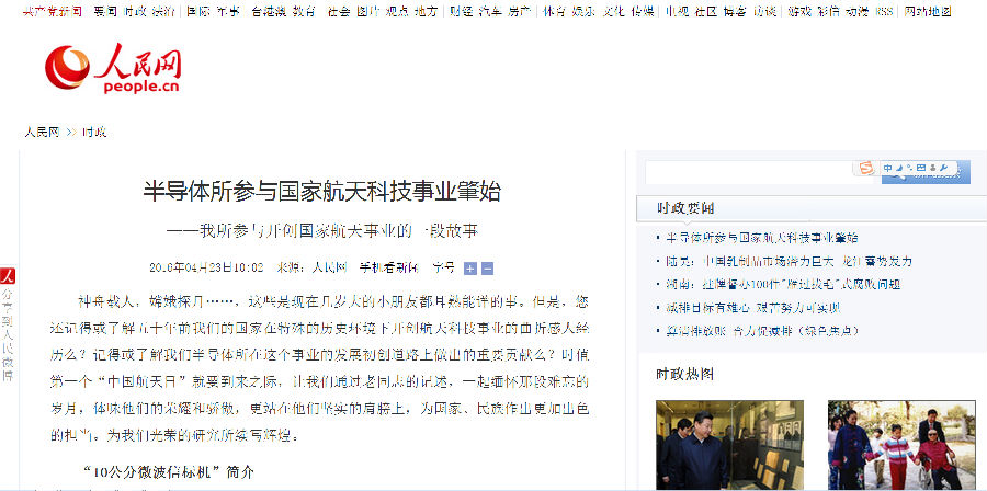 近日,我所老同志的工作记述《半导体所参与国家航天科技事业肇始——我所参与开创国家航天事业的一段故事》被人民网登载(http://politics.people.com.cn/n1/2016/0423/c1001-28298985.html)和央广网、中青网等转载。
