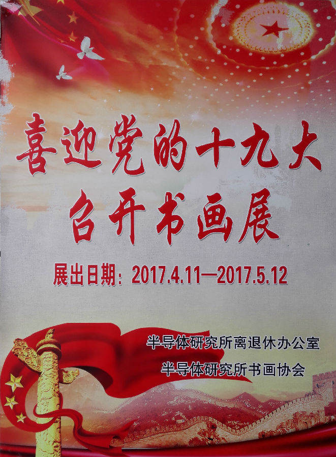 为迎接具有重要历史意义的中国共产党第十九次全国代表大会召开,表达离退休老同志对党、国家和以习近平同志为核心的党中央的深厚情感,展示老同志“珍惜光荣历史、永葆政治本色,继续以身作则弘扬党的光荣传统和优良作风,继续为实现‘两个一百年’奋斗目标、实现中华民族伟大复兴的中国梦作出积极贡献”的拳拳之心。半导体所书画摄影协会与离退休办公室共同主办了“迎接党的十九大召开书画展”。