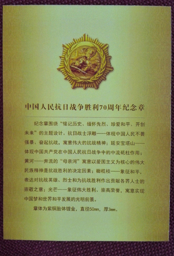 现提供一组“中国人民抗日战争胜利70周年纪念章”照片,供大家同瞻共赏。
