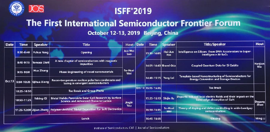 2019年10月12日至13日,由中科院半导体所主办、Journal of Semiconductors编辑部承办的第一届国际半导体前沿论坛(ISFF 2019)在中科院半导体所举行。中科院副院长、国科大校长李树深院士担任大会主席,中科院半导体所副所长(主持工作)谭平恒和Journal of Semiconductors常务副主编李明共同担任组织委员会主席。9位特邀报告专家及冒雨而来的近二百名专家学者和研究生参加了此次会议。