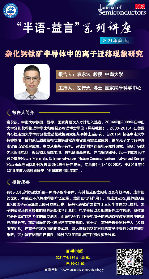 【直播预告】“半语-益言”第2期:中南大学袁永波教授:杂化钙钛矿半导体中的离子迁移现象研究