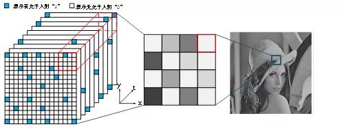 QIS由大量的亚衍射极限像素组成,该像素被称为“jot”(希腊语中意为最小的东西),jot的输出“0”表示没有光子入射,“1”表示有光子入射。jot尺寸可突破光学镜头的衍射极限,像素阵列以高速率被扫描,帧频远大于物体的运动速率(保证每个像素帧内的平均入射光子数量少),通过对一定数目像素的多帧输出量化值进行处理,可以得到输出图像,如图1所示。